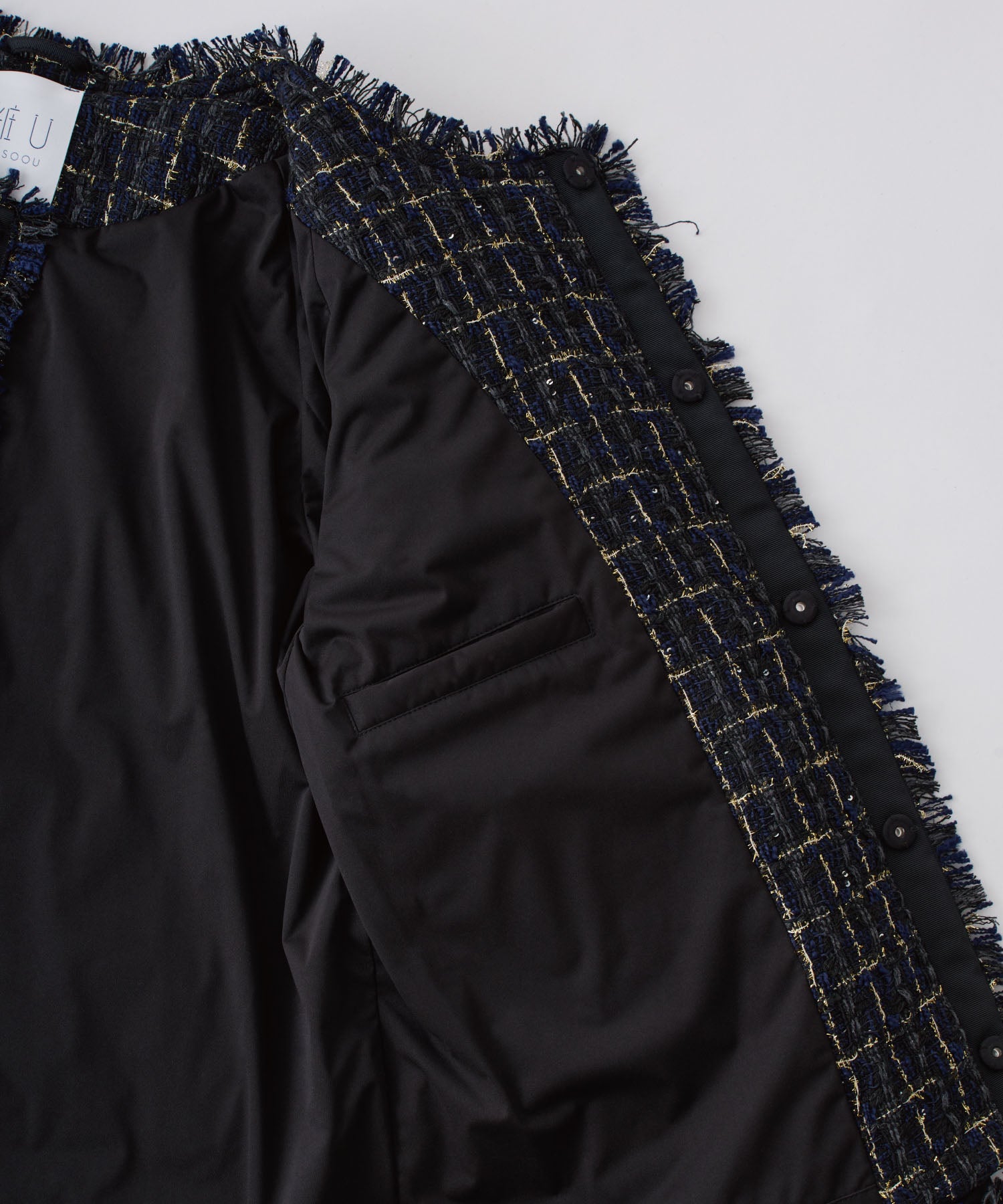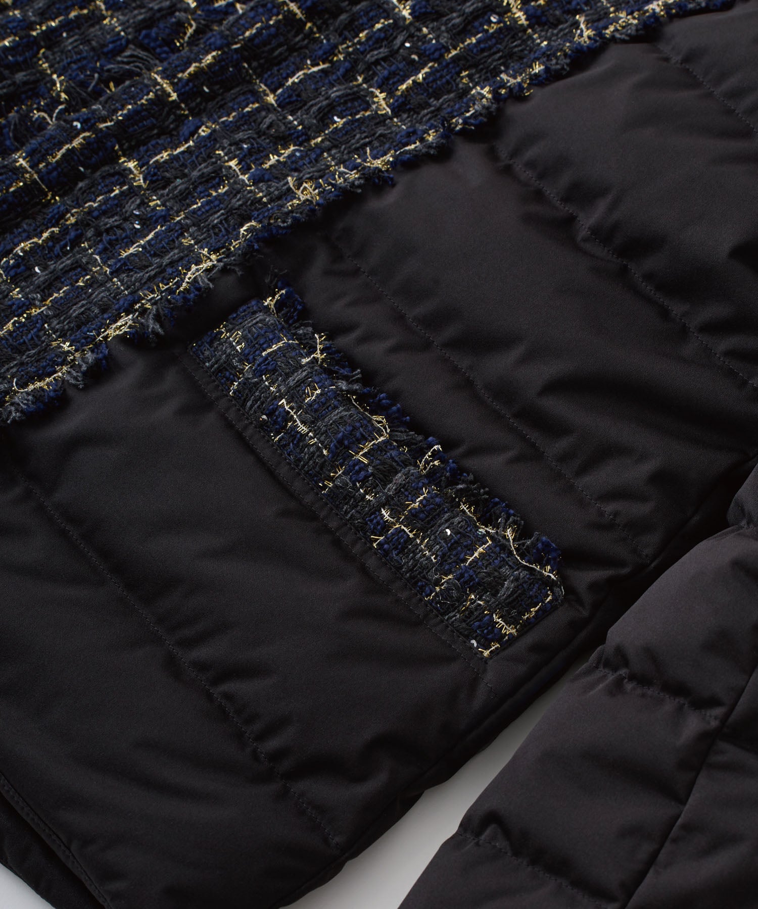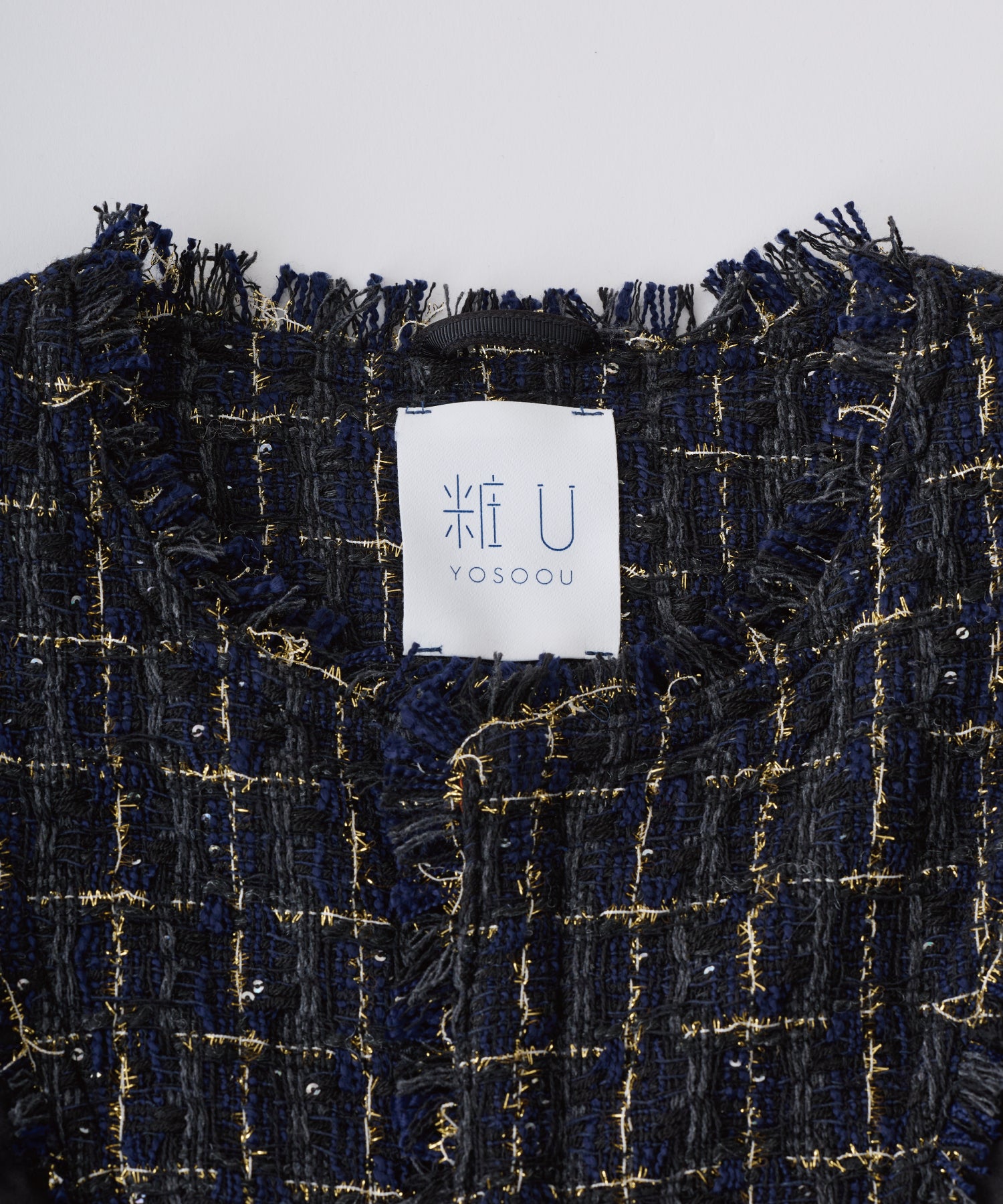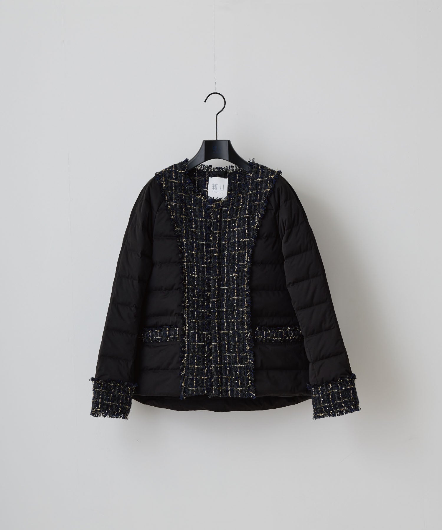ツイードを取り入れたデザインで華やかながらもノーカラーでスッキリとした上品な印象に。