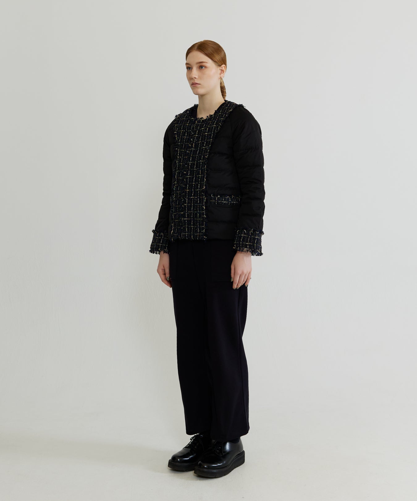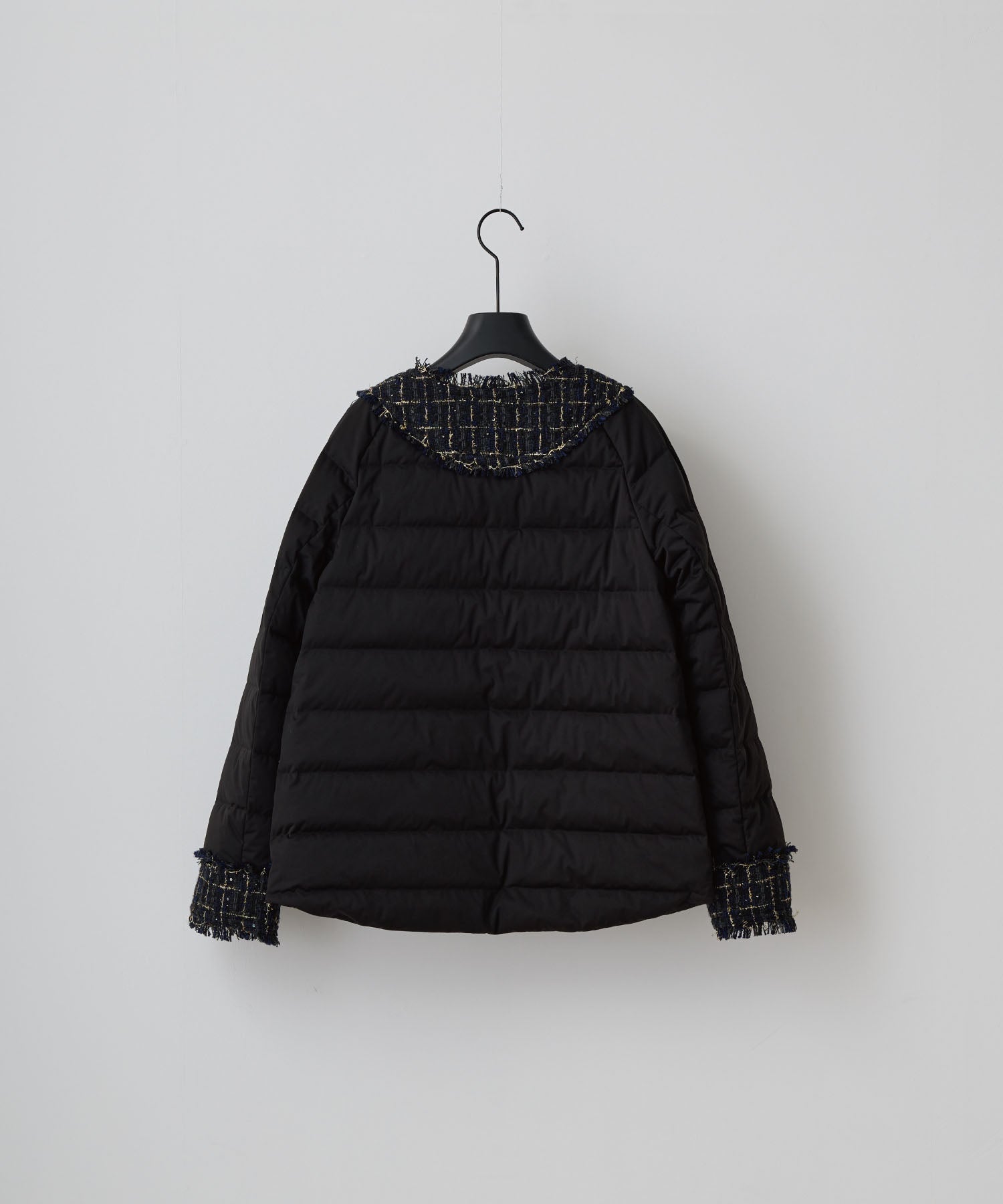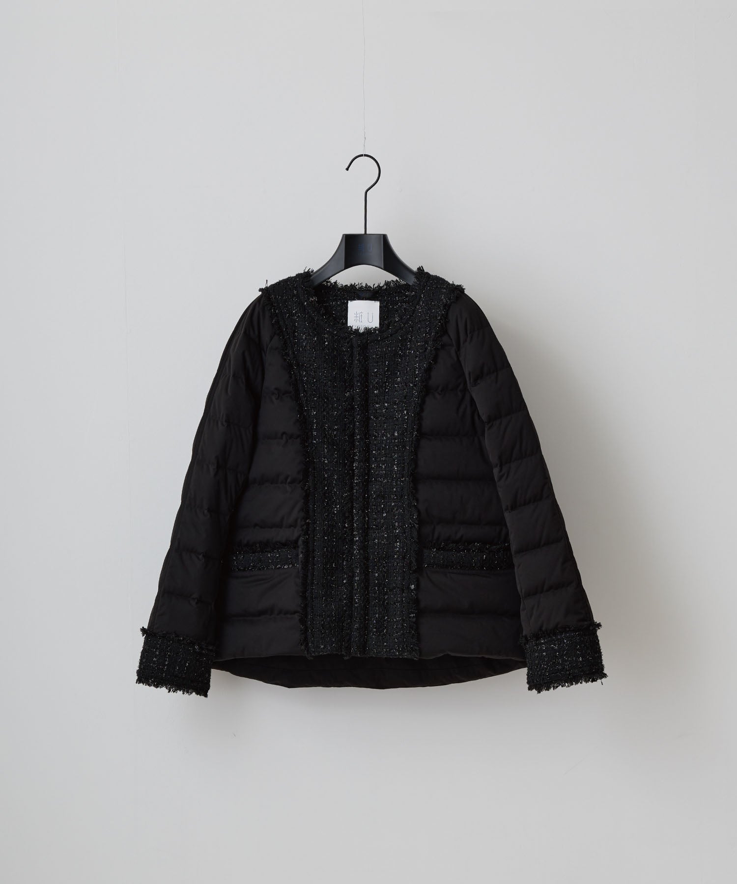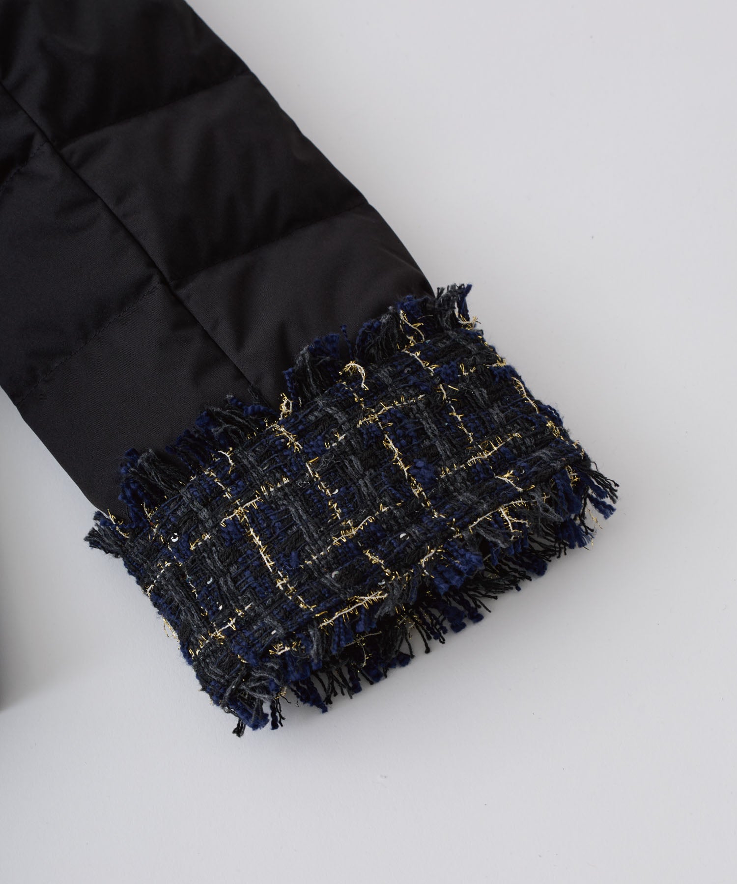ツイードを取り入れたデザインで華やかながらもノーカラーでスッキリとした上品な印象に。