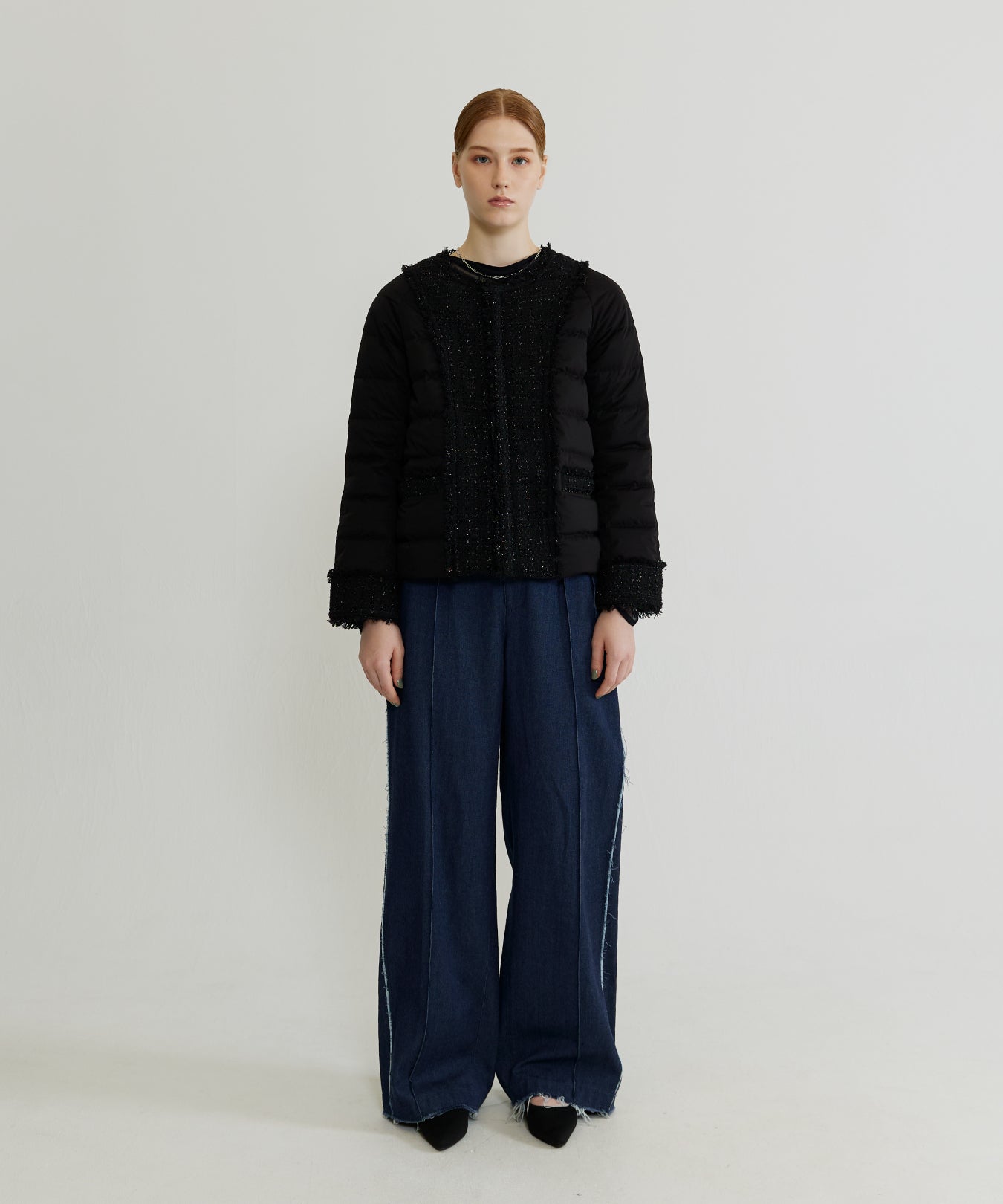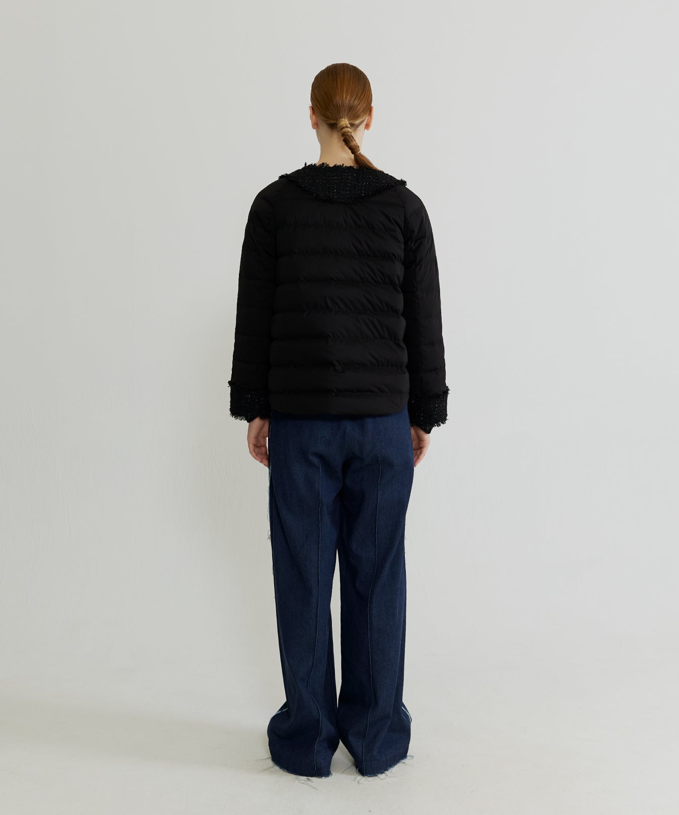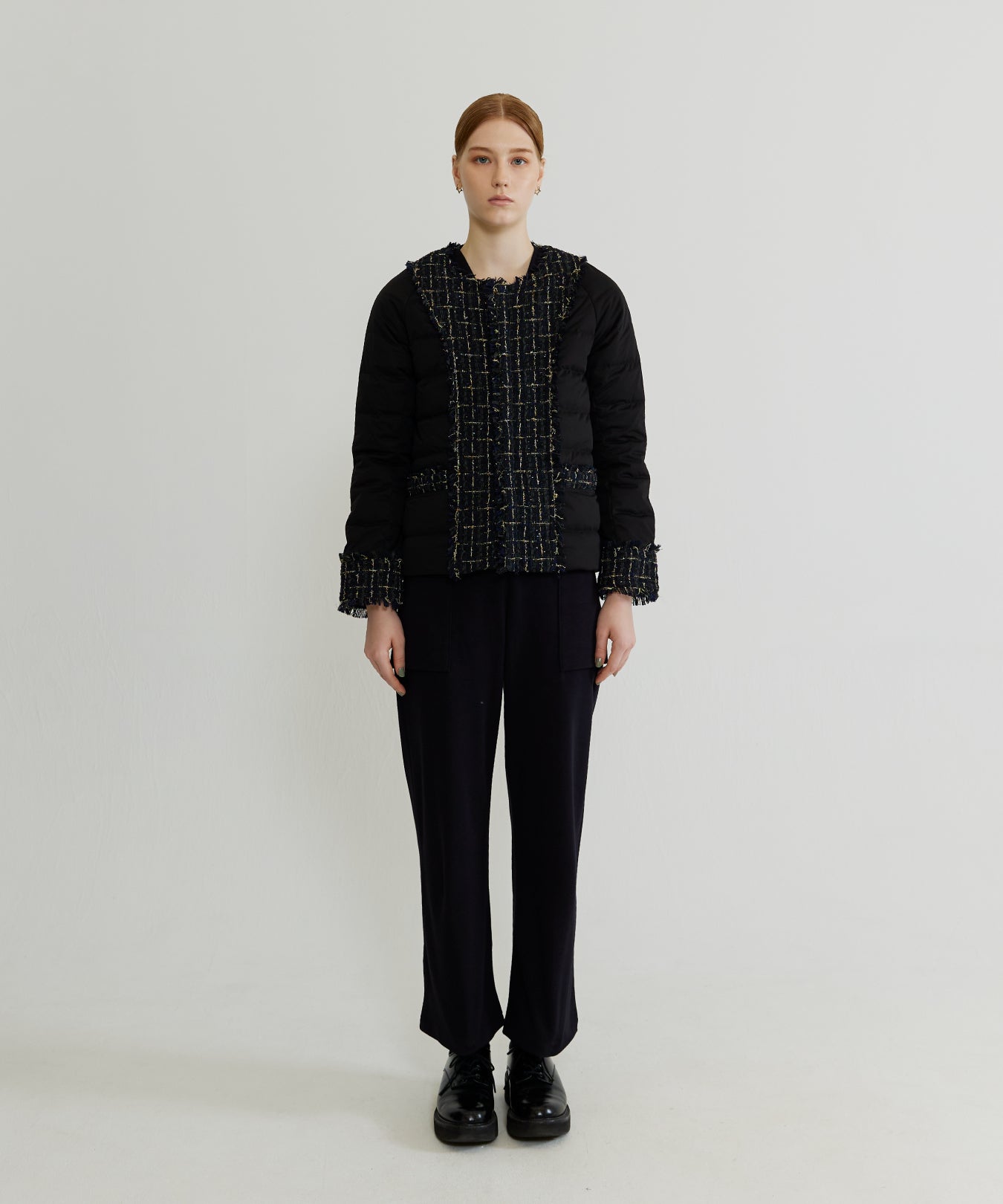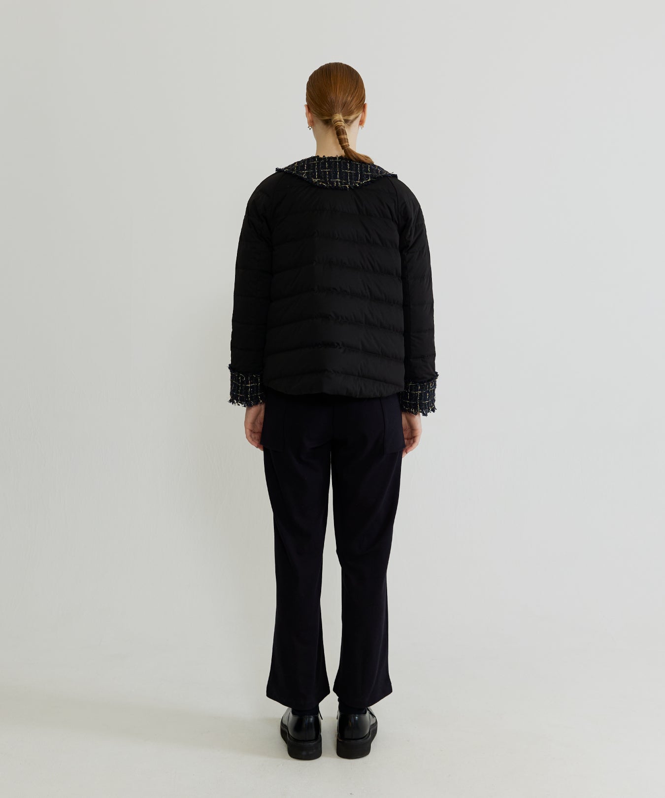 ツイードを取り入れたデザインで華やかながらもノーカラーでスッキリとした上品な印象に。