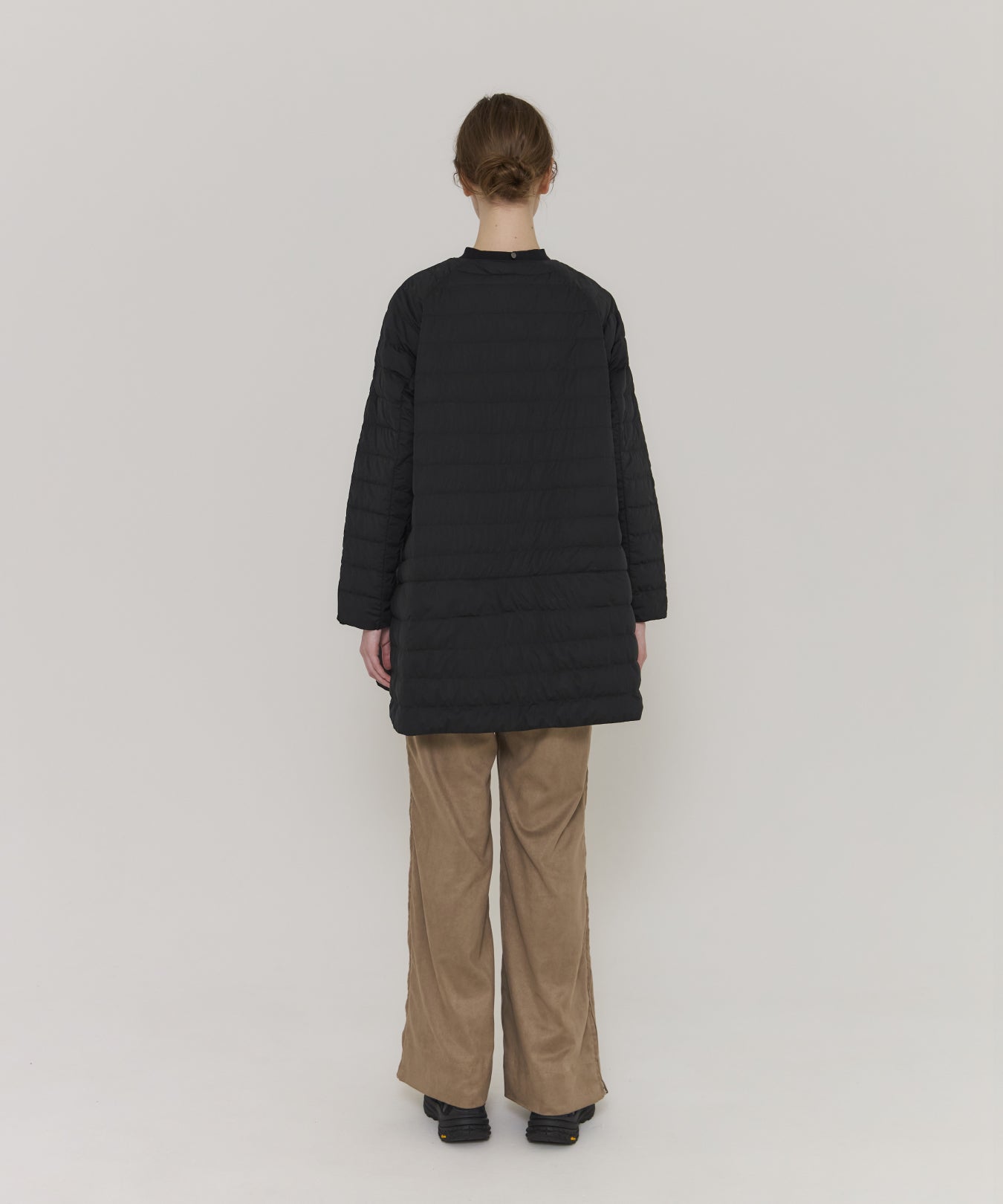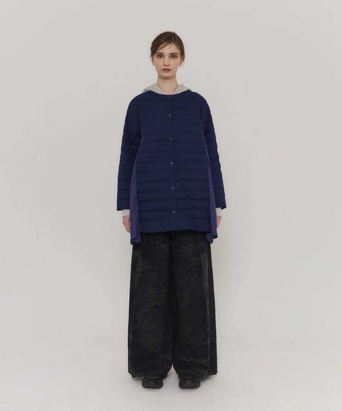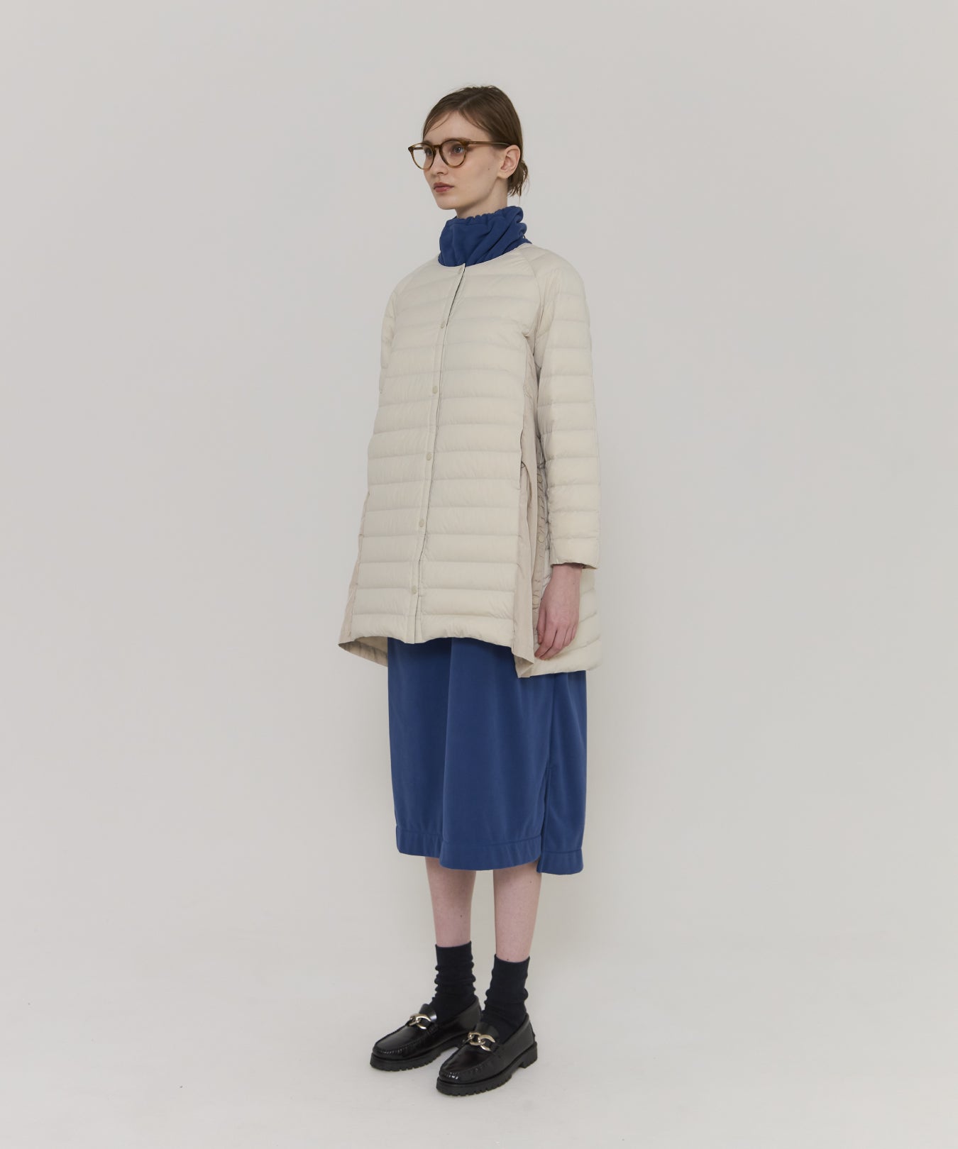 両前脇下はダウンを入れず薄手のナイロン生地で切り替え、両脇にデザインされたサイドスリットは釦で開き具合を調節できます。