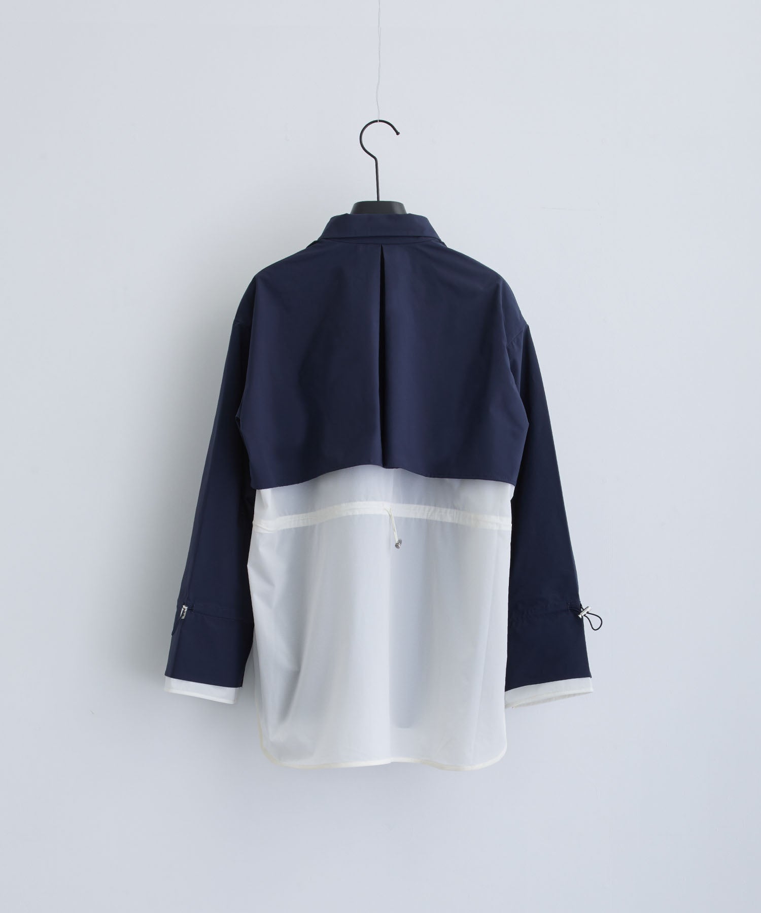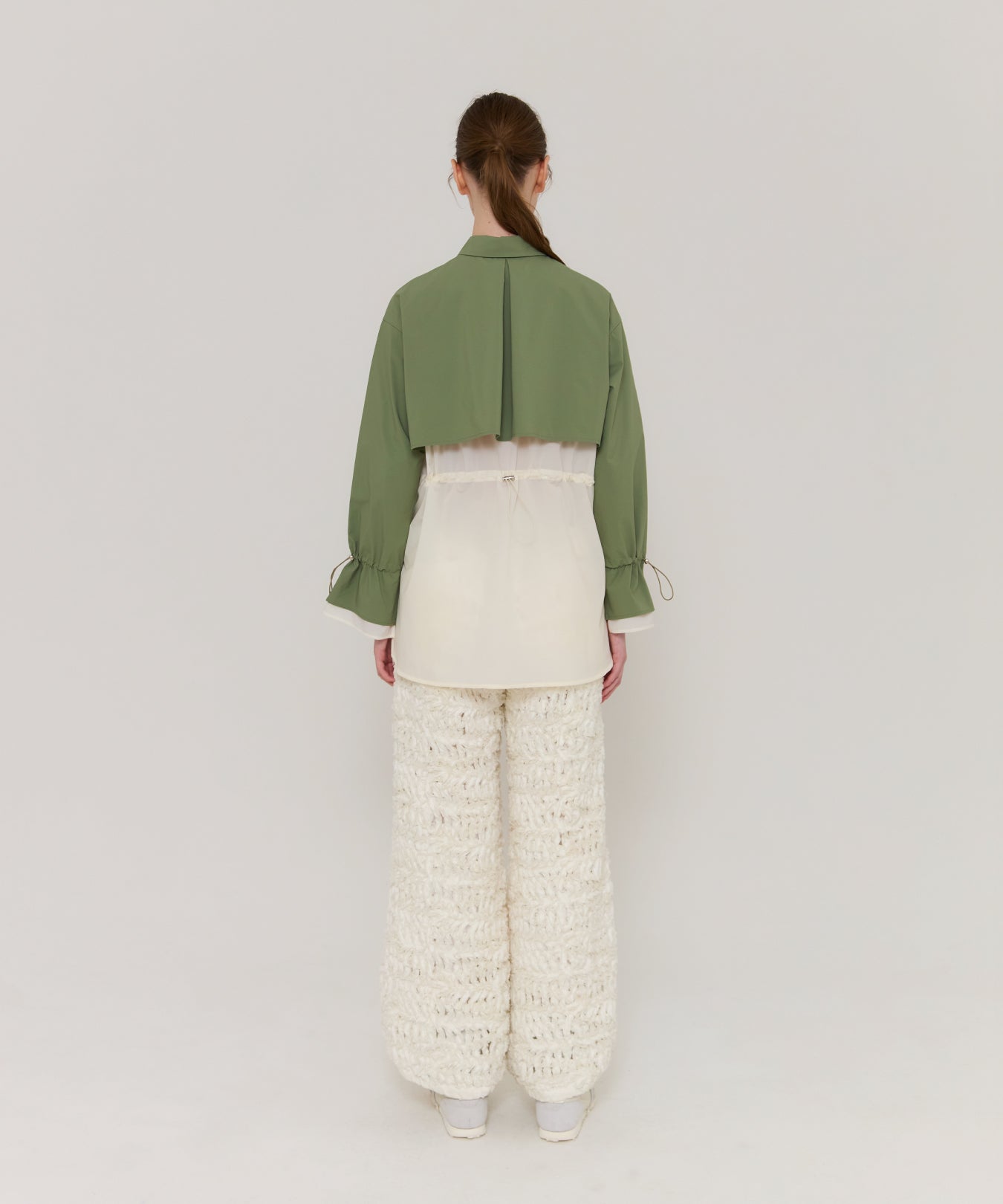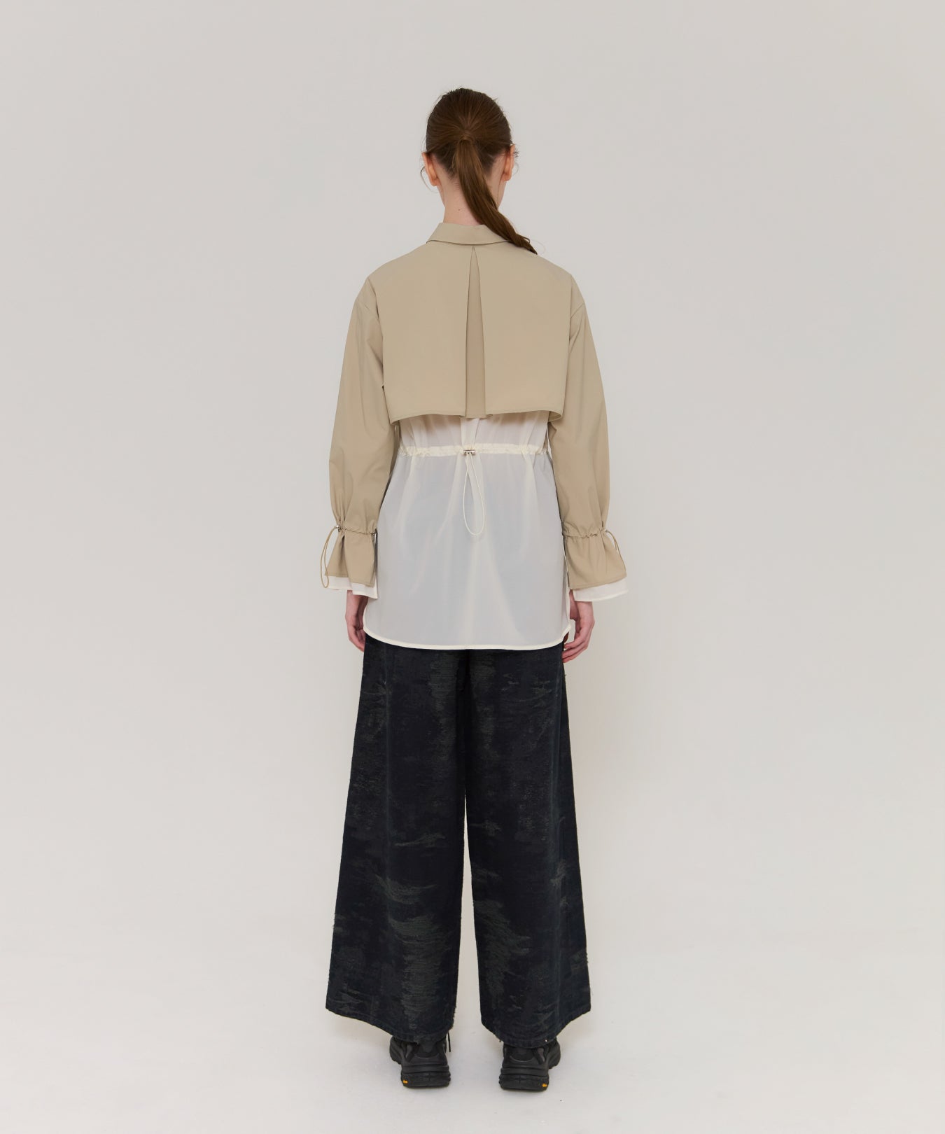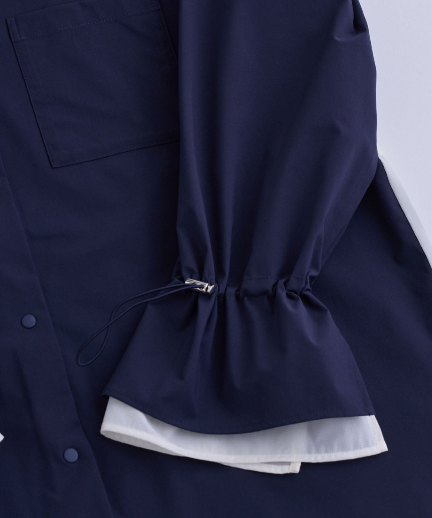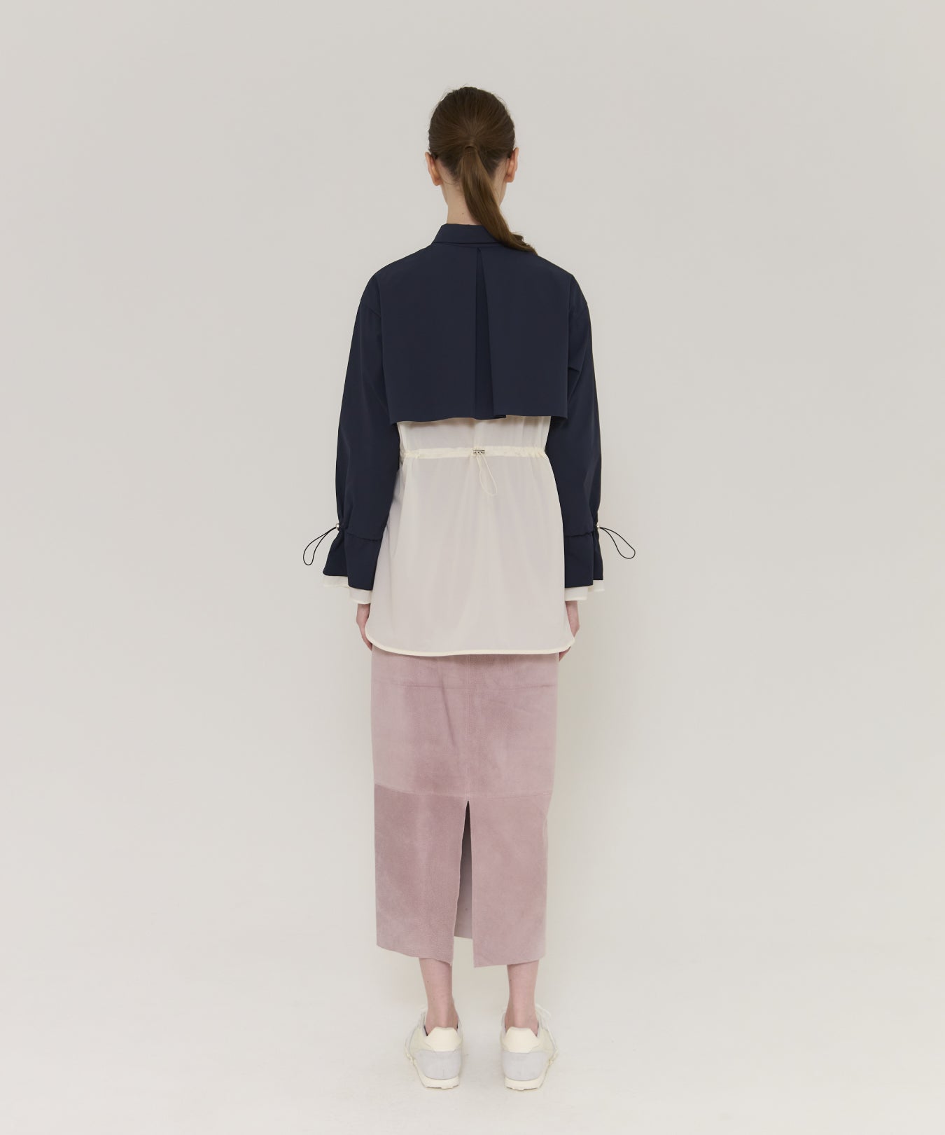 袖口や背中のドローコードを絞ることで、フェミニンなシルエットにアレンジ可能。