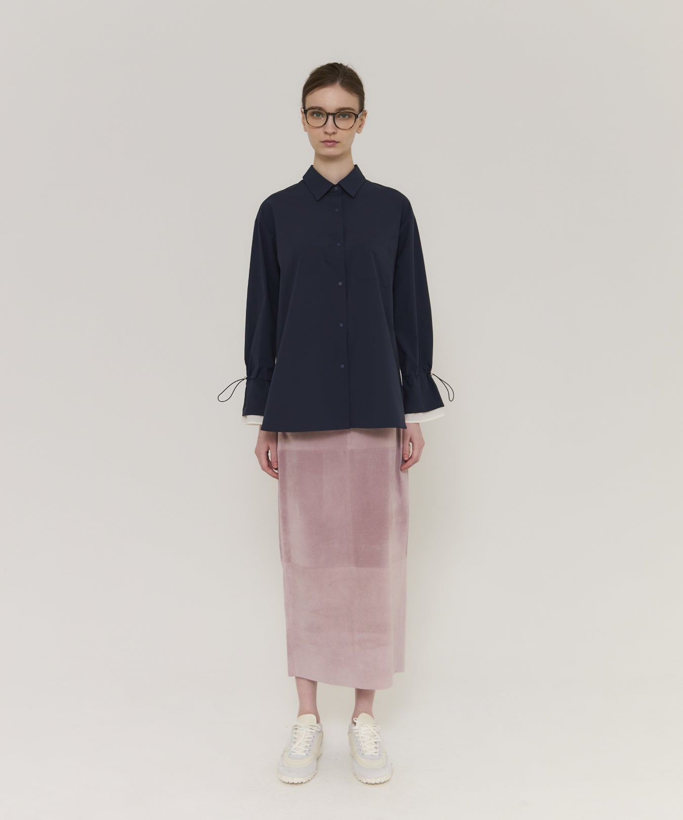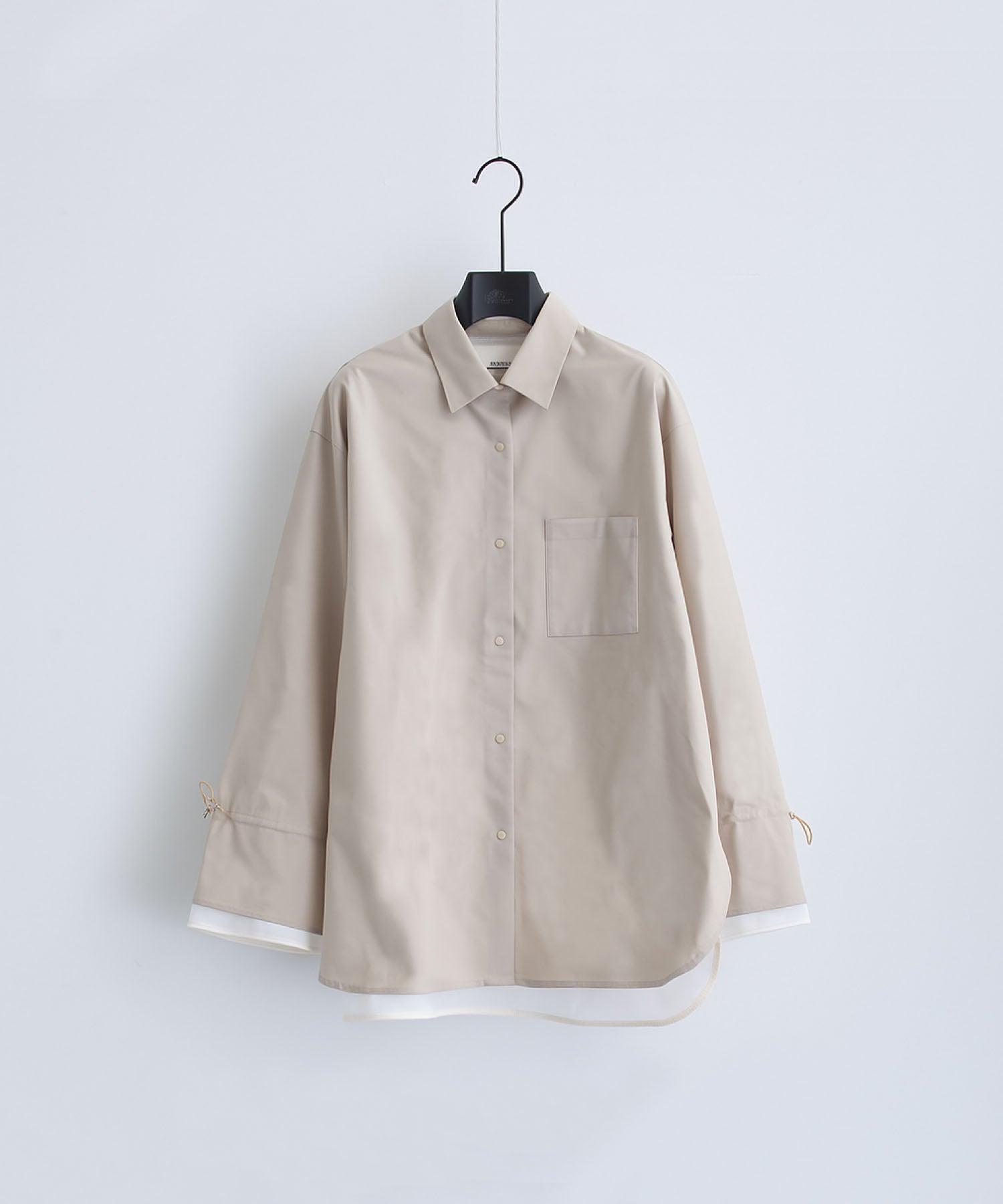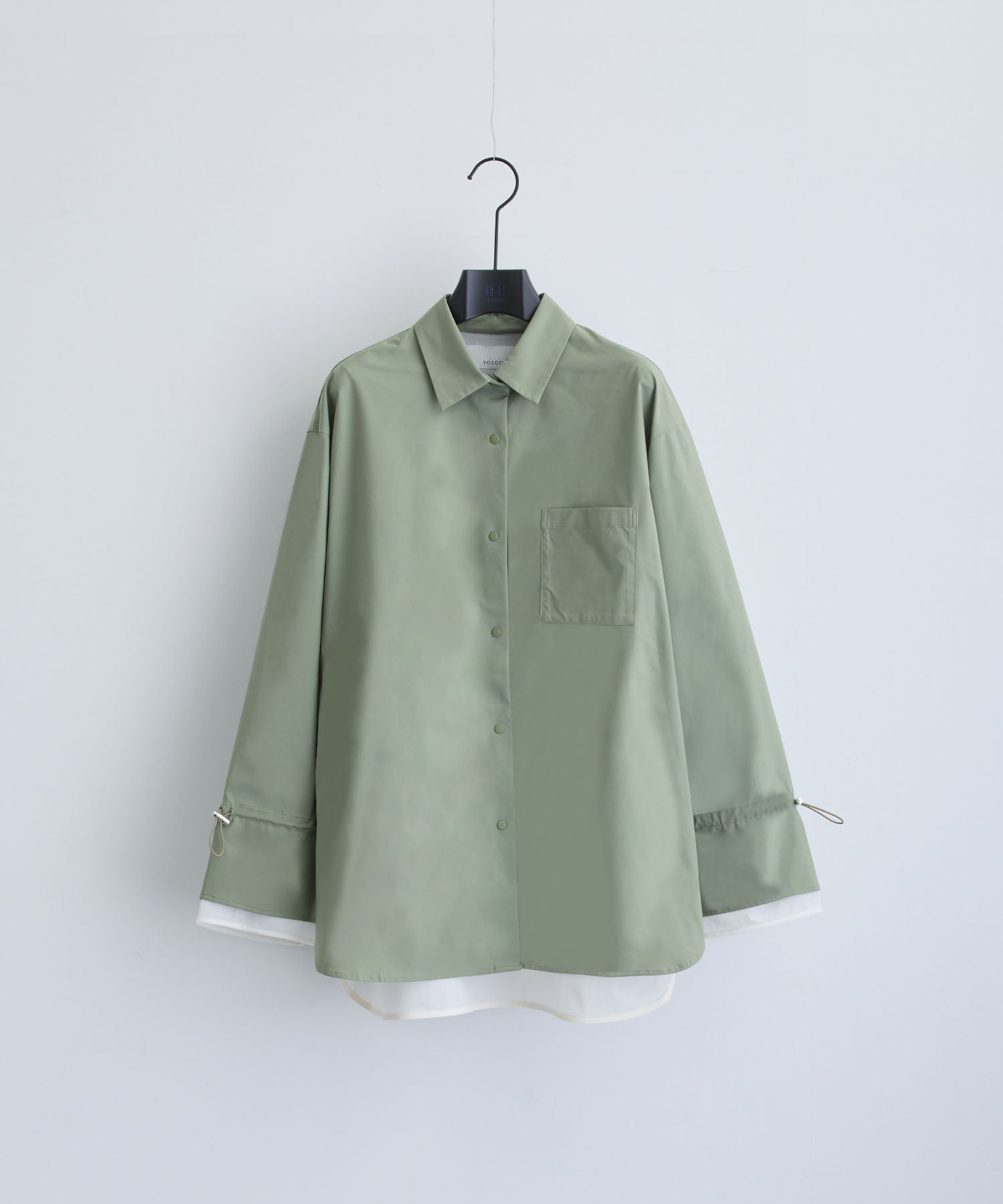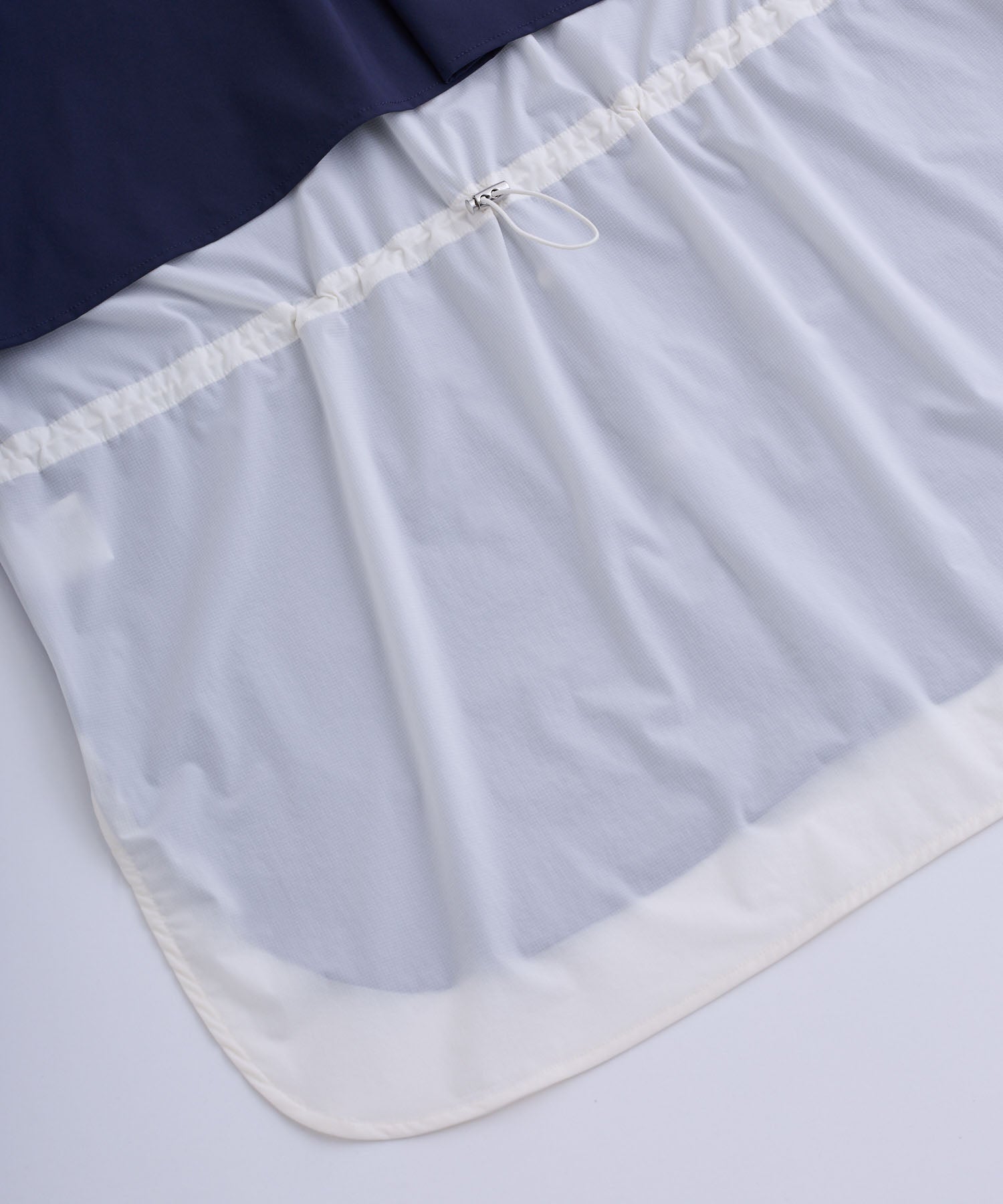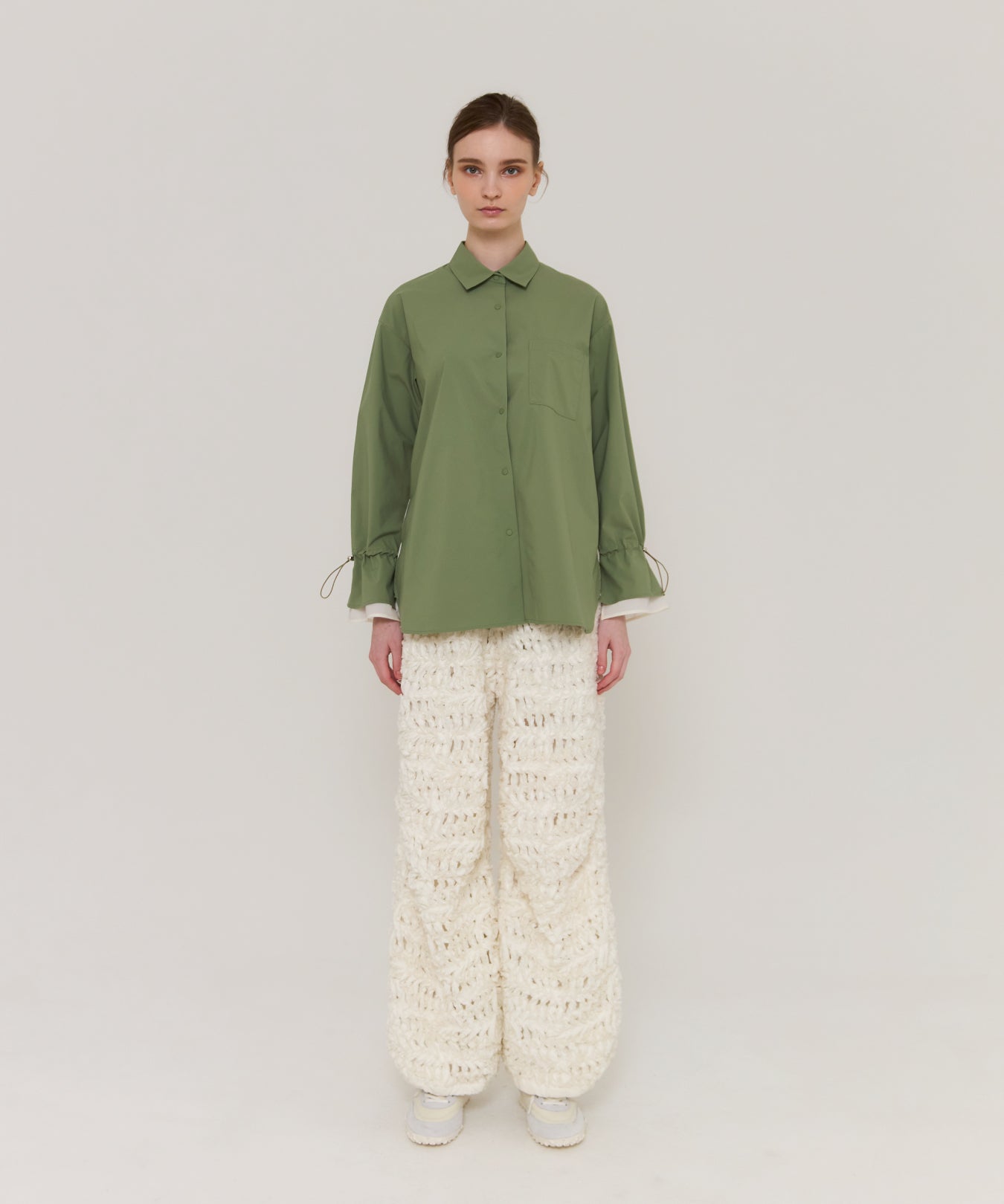 袖口や背中のドローコードを絞ることで、フェミニンなシルエットにアレンジ可能。