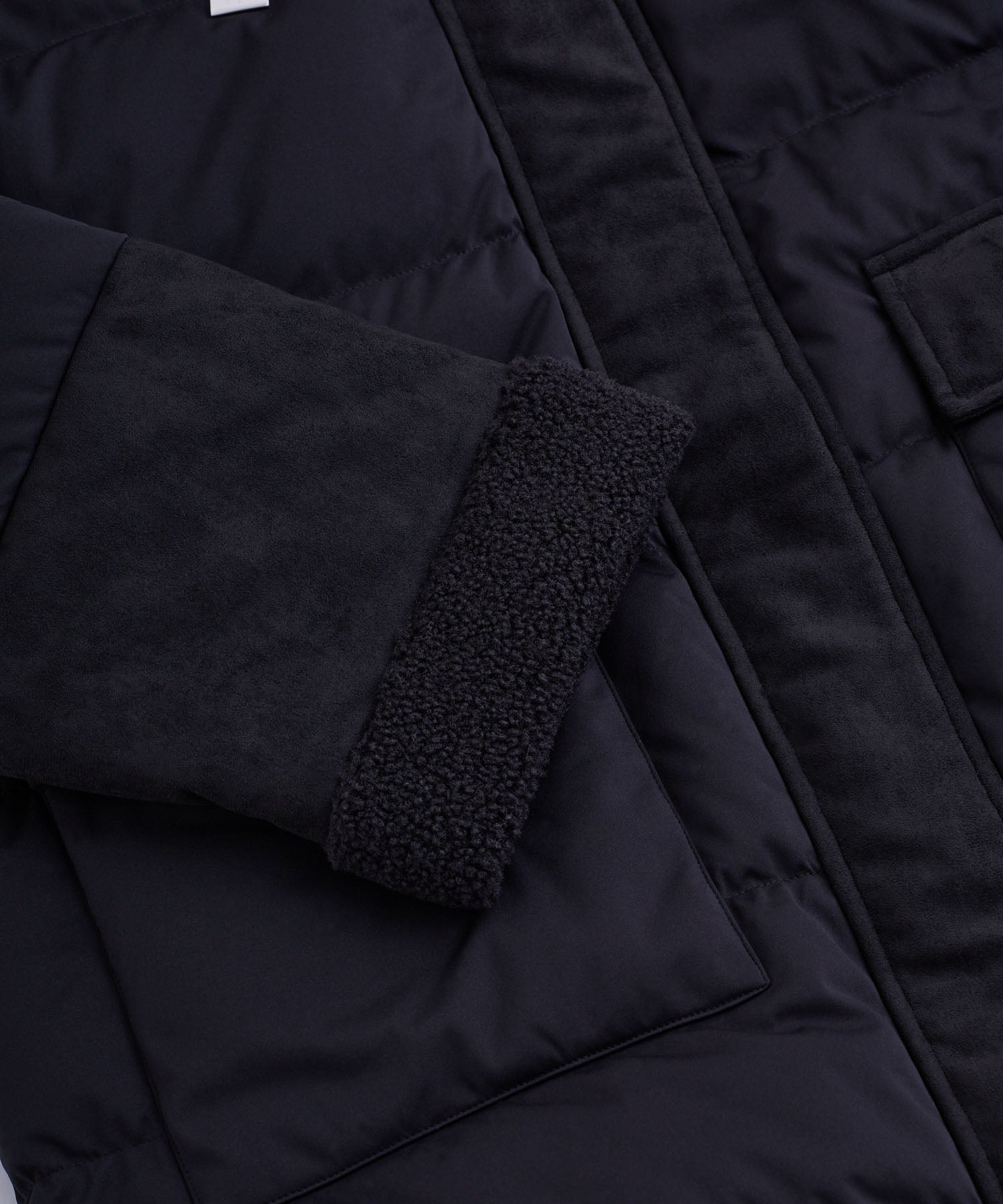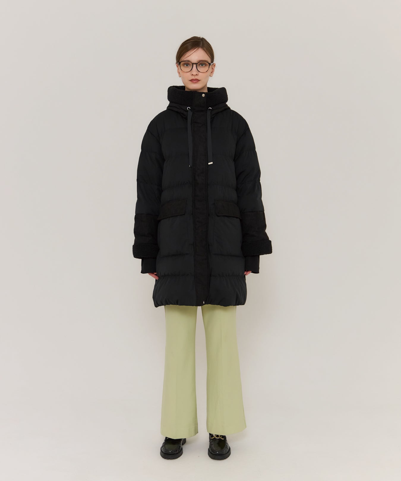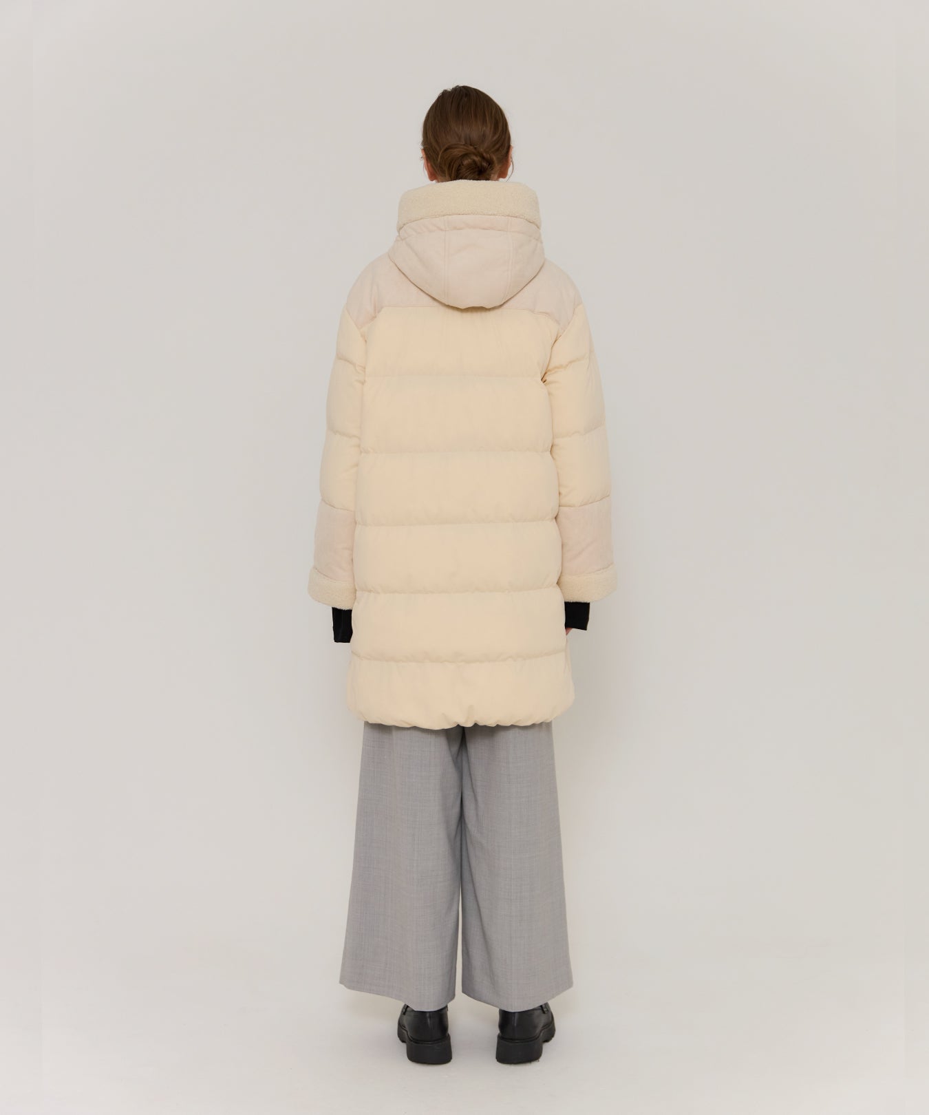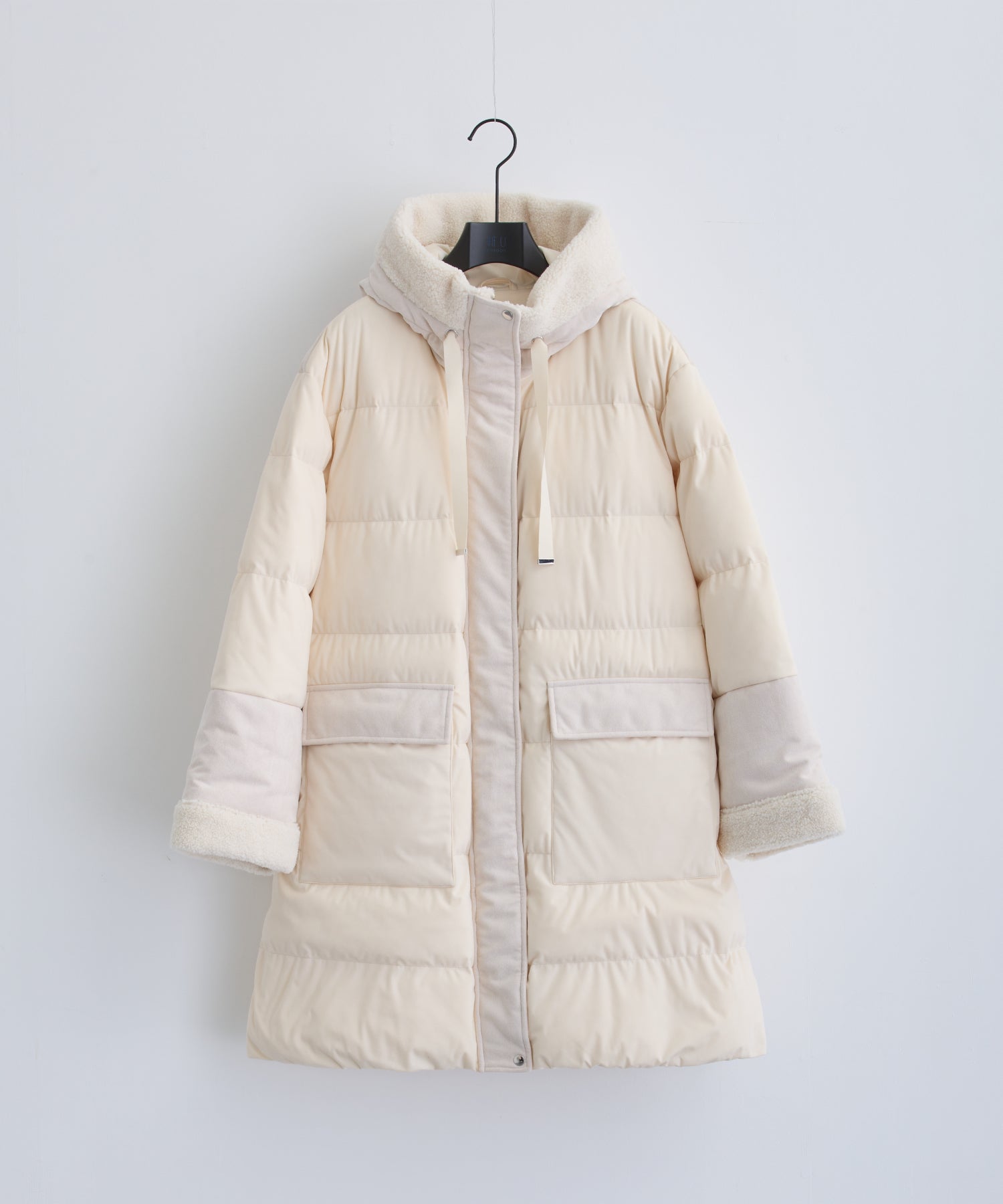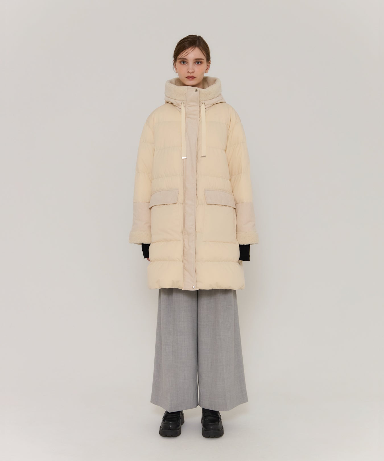 高さのあるスタンドフードは内側までしっかりとボアをあしらうことで、襟周りを温かく包み込みます。